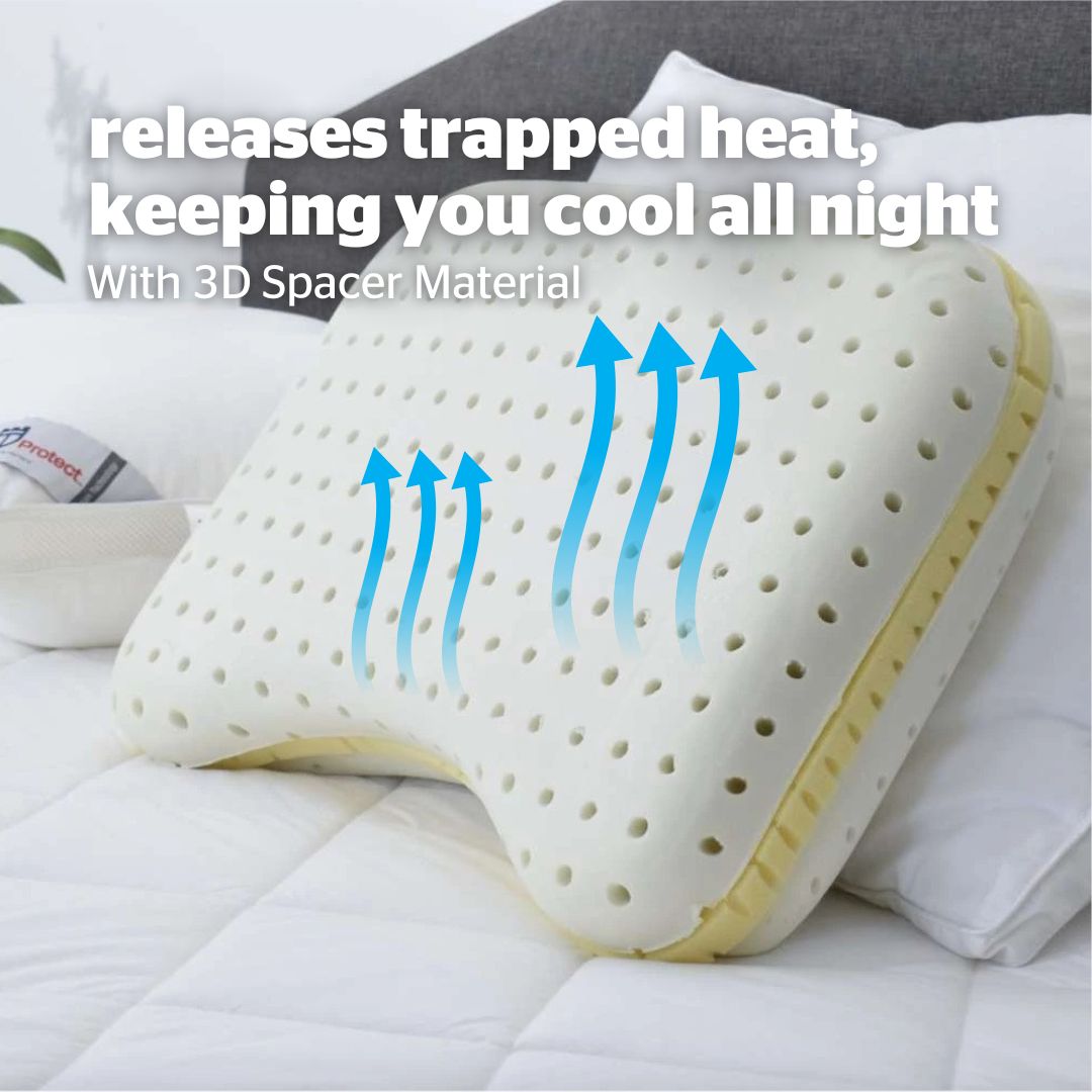 The 3D spacer material ensures that the pillow is well ventilated. Smooth microfiber casing, filled with laboratory certified anti-bacteria fibre from Japan, provide a soft and cushy sleep experience. The adjustable memory foam core, with rows of holes for air flow, allows air to circulate freely and regulates the temperature of the sleeping surface.